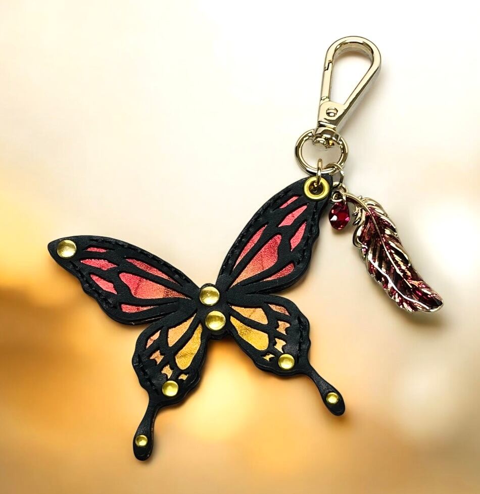 天然皮革を蝶々型にレーザーカット、模様入れをしてキーホルダーにしてみました。蝶々の大きさはそこそこあるのでバッグのチャームポイントに。