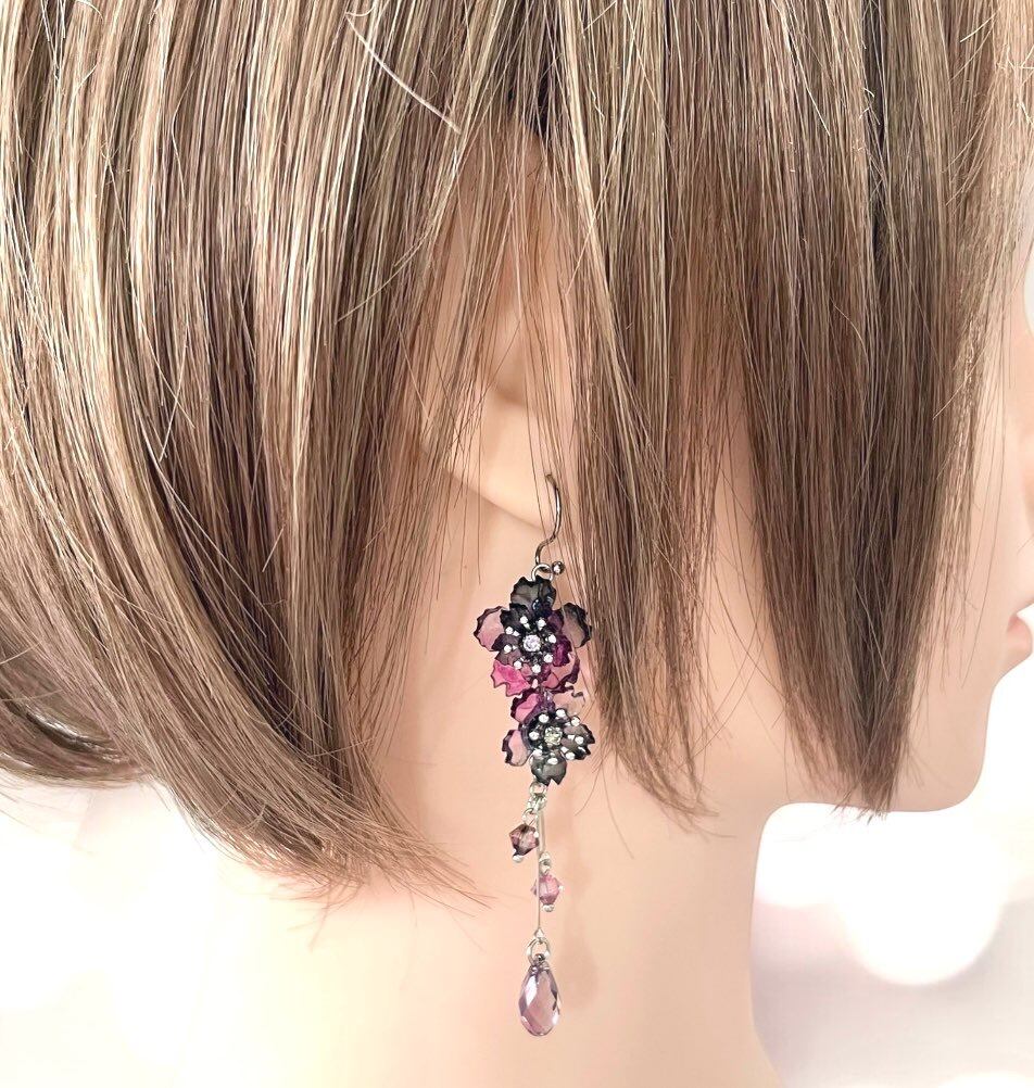 立体的な桜をモチーフにしたピアス/イヤリング。推し色の桜を選んでいただければと思います。
