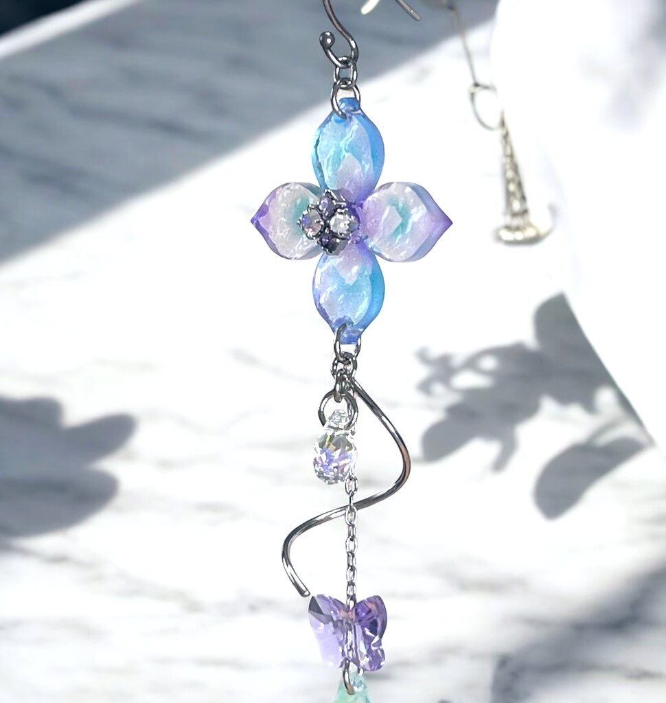 アクリル(レーザー加工・UV加工←UVレジンで加工していることではありません。)・貴和クリスタル・レジン・金具:真鍮(シルバーカラー・画像参照)