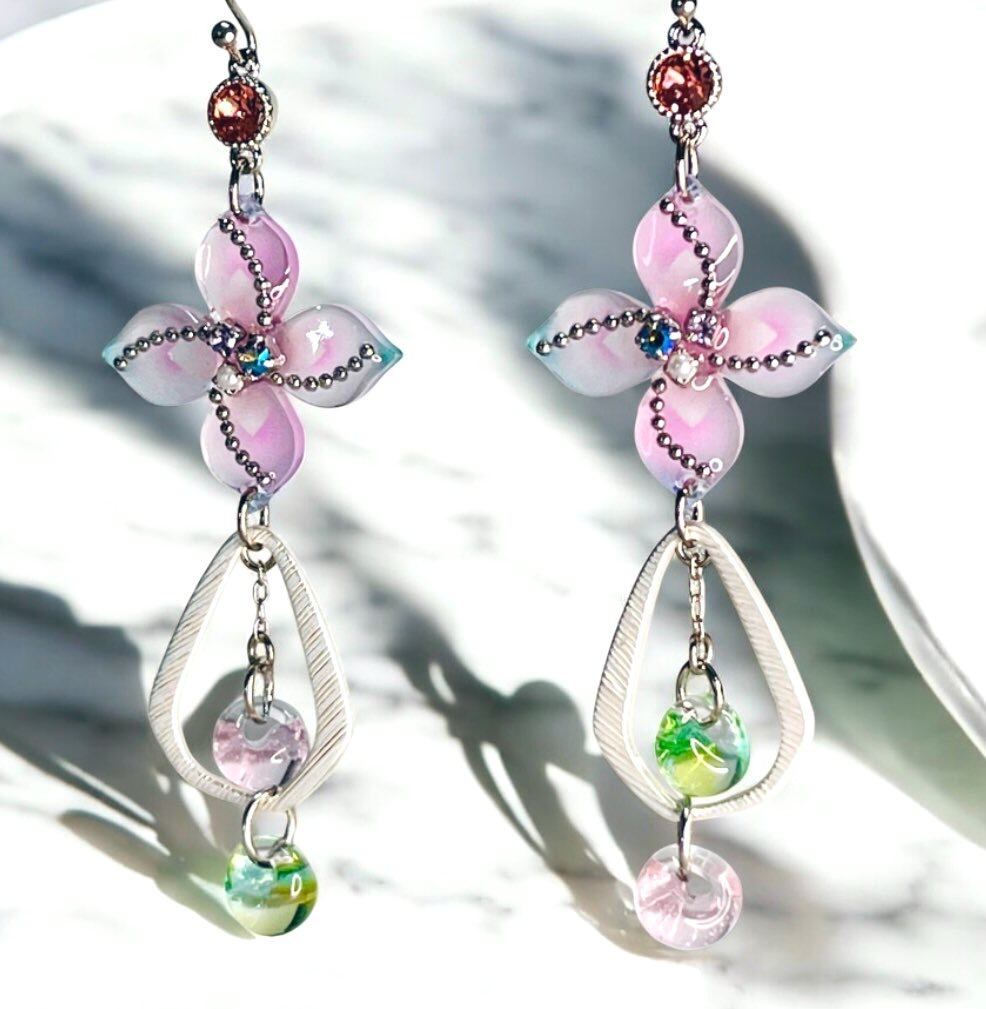 大ぶりな紫陽花をモチーフにしたピアス/イヤリング。チェーンやストーンを添えて独特な雰囲気に仕上げてみました。