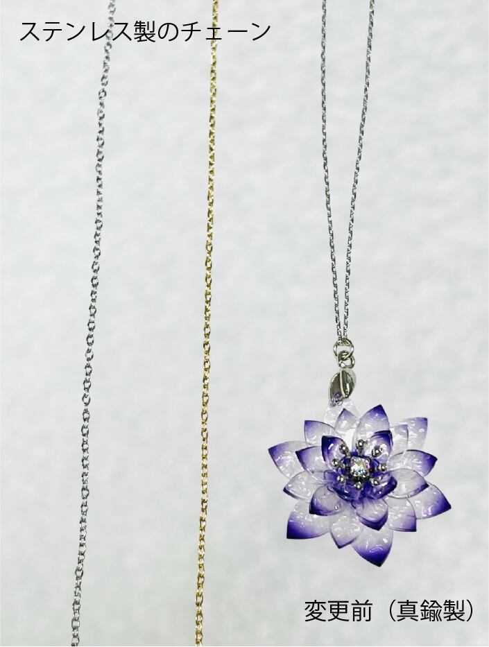 *オプションにてステンレス製のチェーンに変更は可能ですがチェーンの形状、長さ、留め具等に仕様の変更が発生しますことをご理解の上でお求めください。(画像4枚目以降参照)