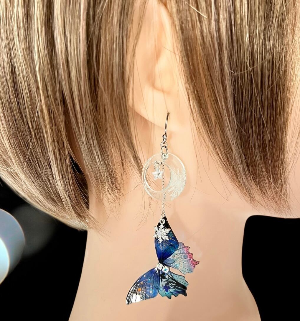 トップの三日月は透明のアクリルに特殊加工で雪の結晶の模様を入れて少しだけ立体感のあるパーツに。蝶々の翅は菖蒲や花火模様を入れてみました。