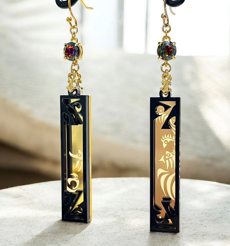 タトゥーっぽい模様をゴールドのミラーアクリルに彫刻したり黒の透かしパーツで表現してみました。(画像2枚目は光の当たる角度等で黒くなっていますが実物は1枚目の状態です。)トップ部分には少し変わったカラーのストーンを。