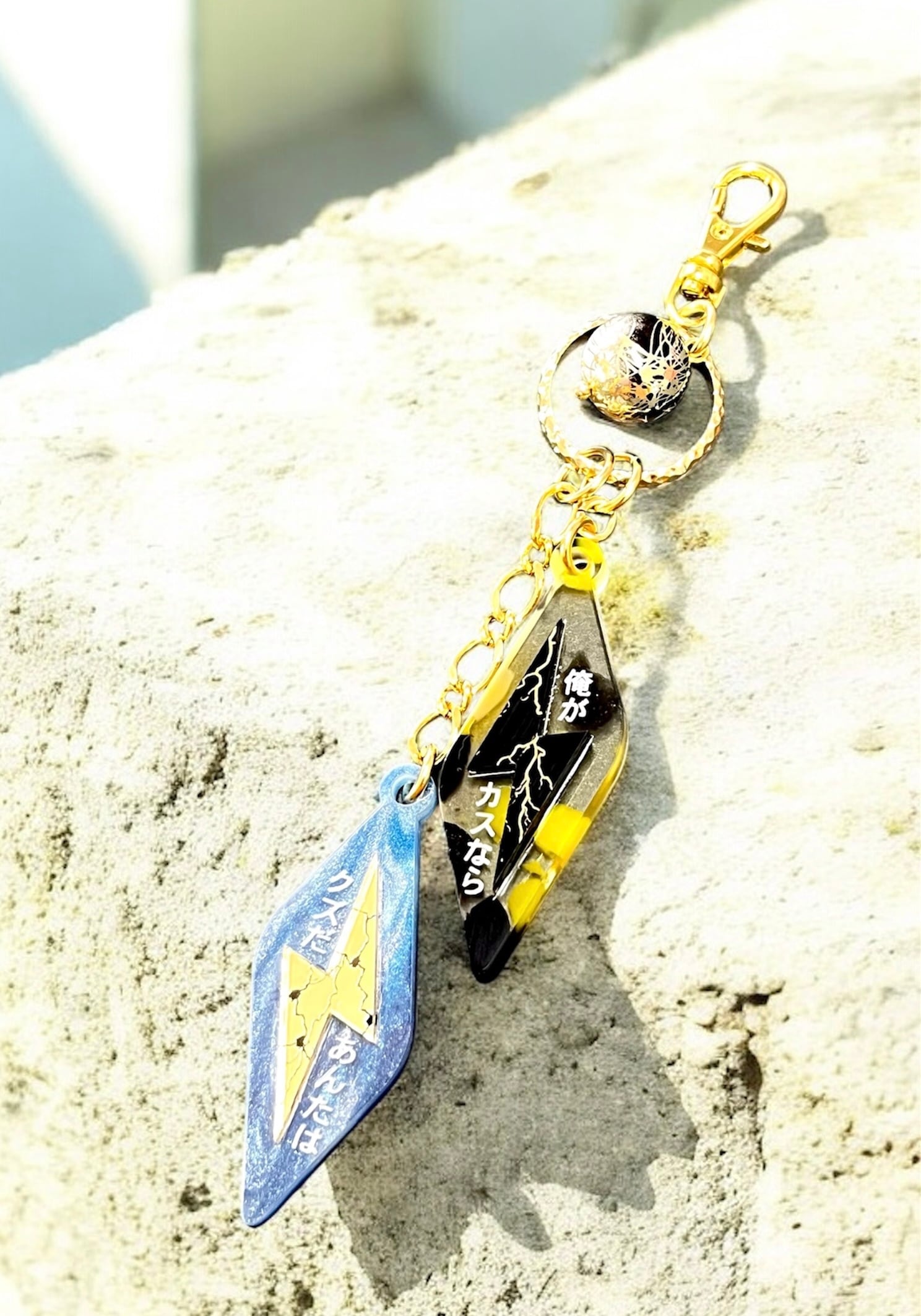 それぞれをイメージしたカラーのアクリルに彫刻を入れて、刀のカラーを意識した雷モチーフを添えてバッグチャームにしてみました。