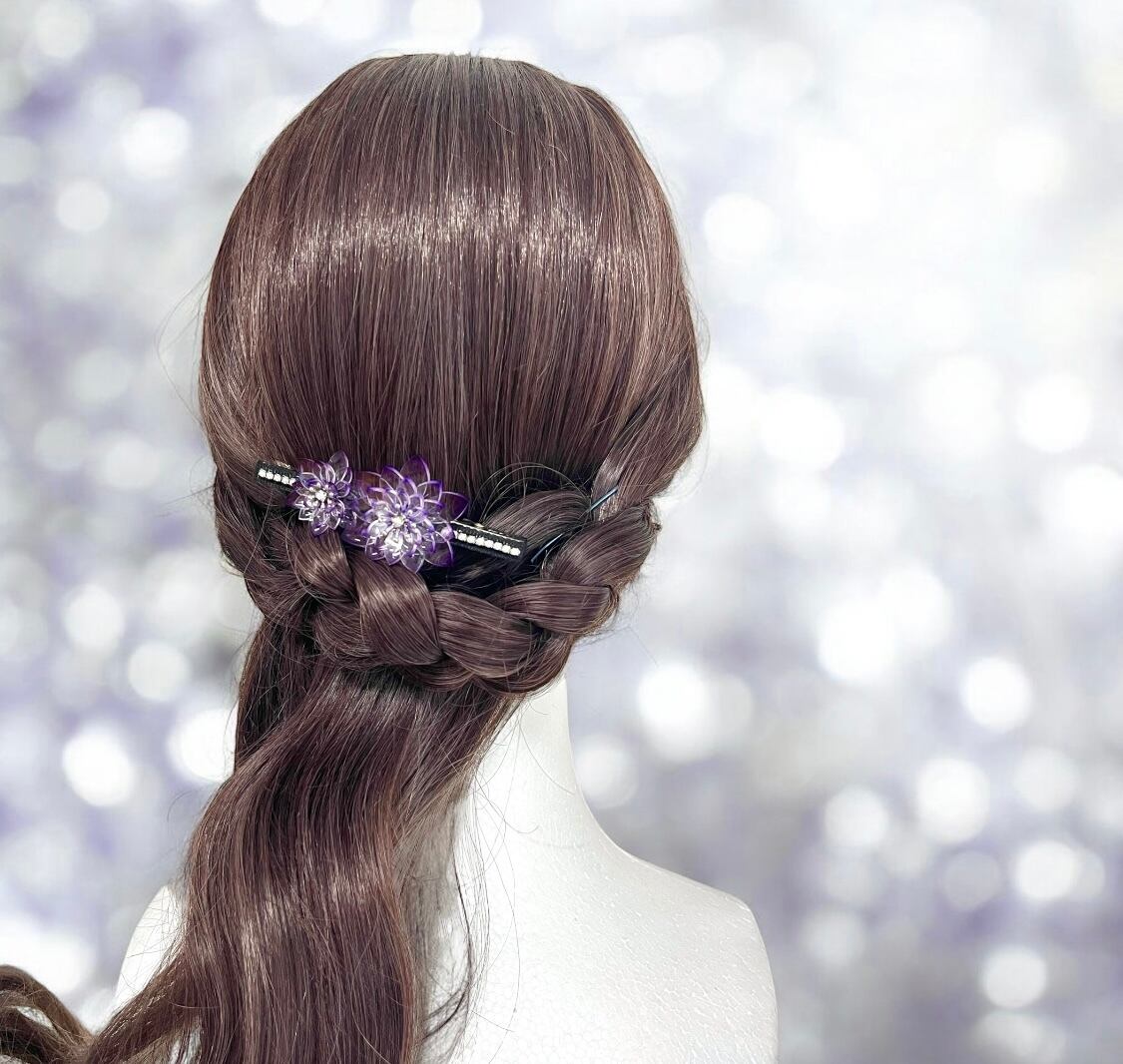 紫色に染めた立体的な蓮の花をヘアクリップに。藤の花の毒がじわじわと広がっていくようなカラーに仕上げてみました。利き手関係なく左右どちらからも身につけやすいデザインに。ヘアクリップの長さは8cm程度ですが細めのものを使用しているのでそこまで大きくは見えないかも。