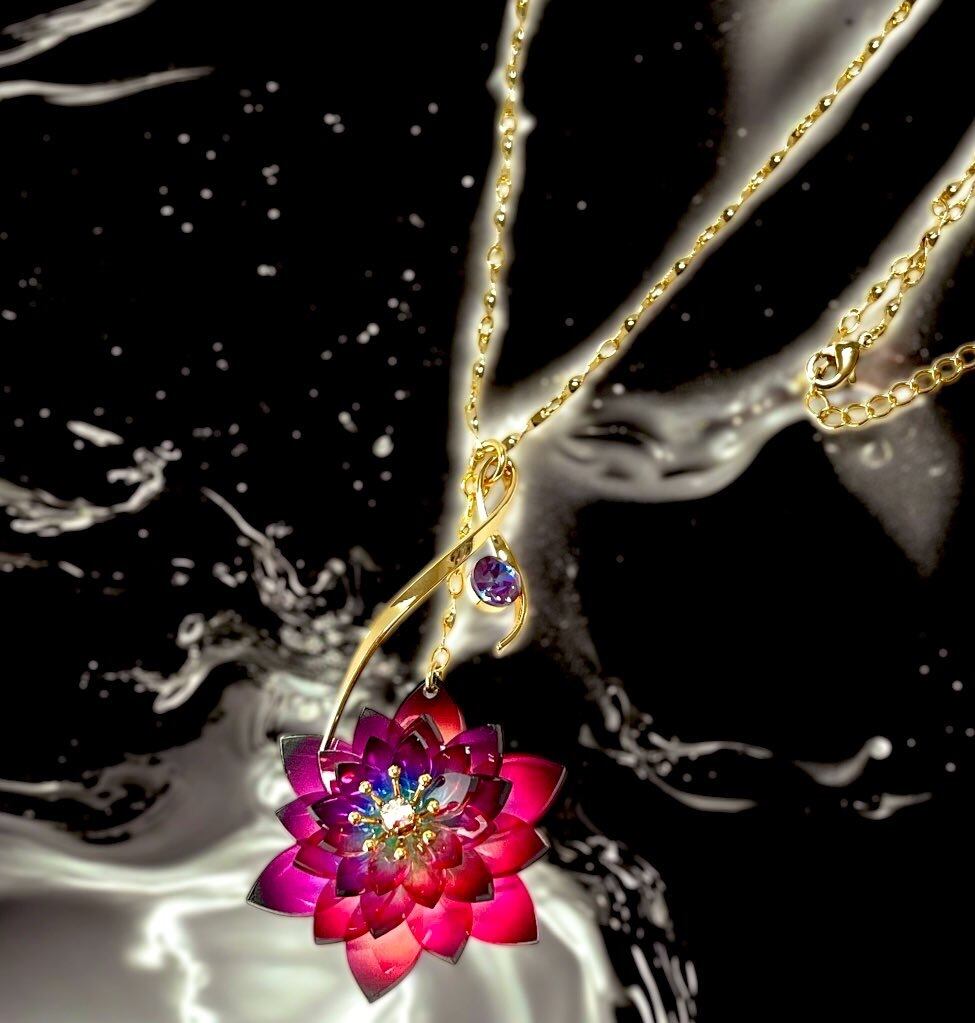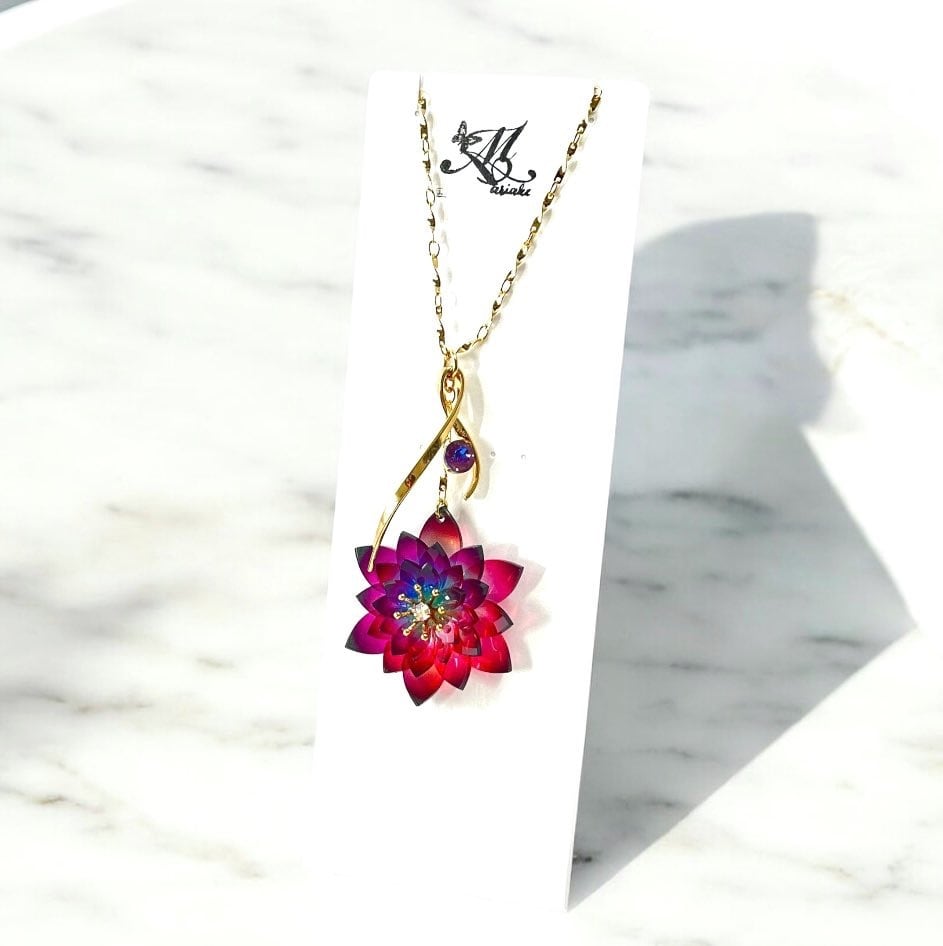 4cm程度の大きめの睡蓮モチーフのネックレス。赤みが強めの虹色の睡蓮が独特でわかる人にはわかるカラーに仕上げてみました。
