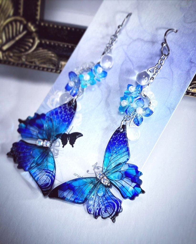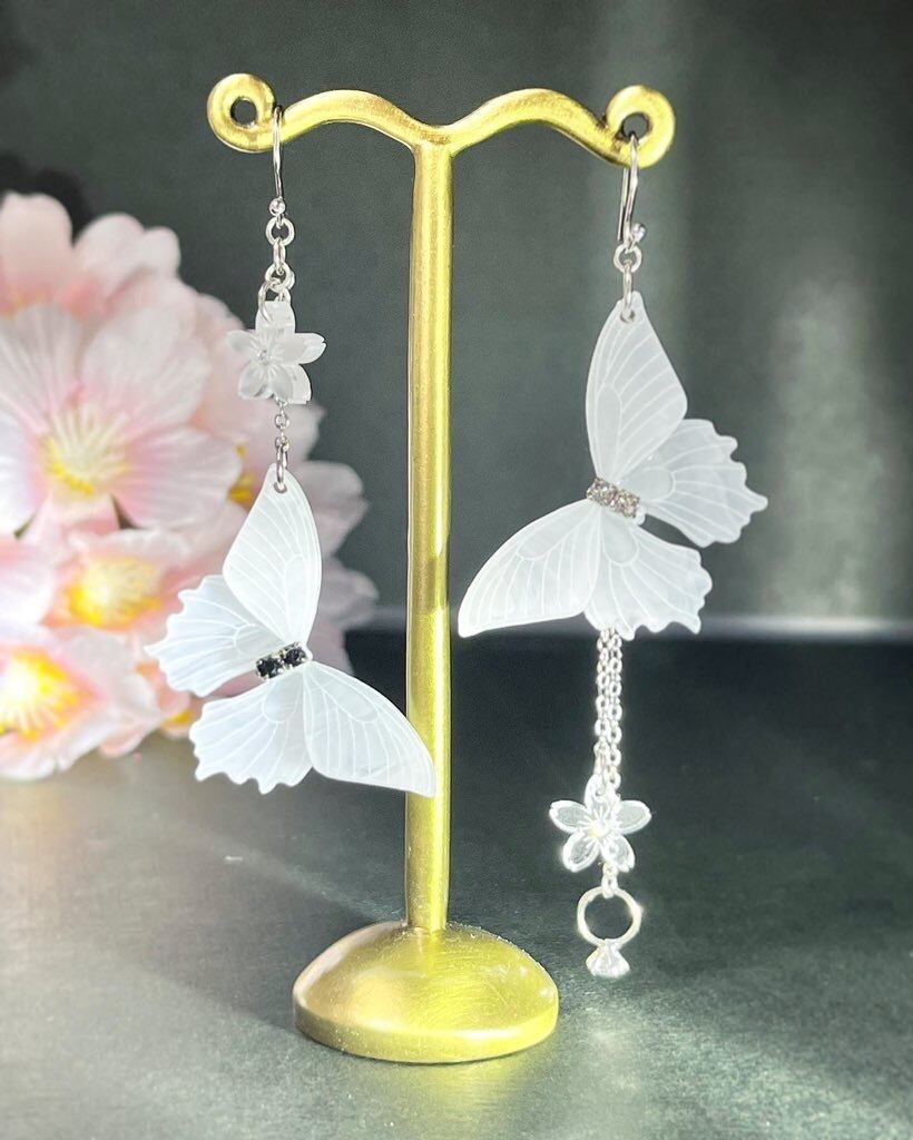 立体的な蝶々の作品及び蝶々の羽根の作品は本物の蝶の羽根のような繊細な雰囲気を表現するため市販ではあまり見かけない薄いアクリルを取り寄せて制作しています。通常より繊細な作りとなりますためお取り扱いにはご注意ください。