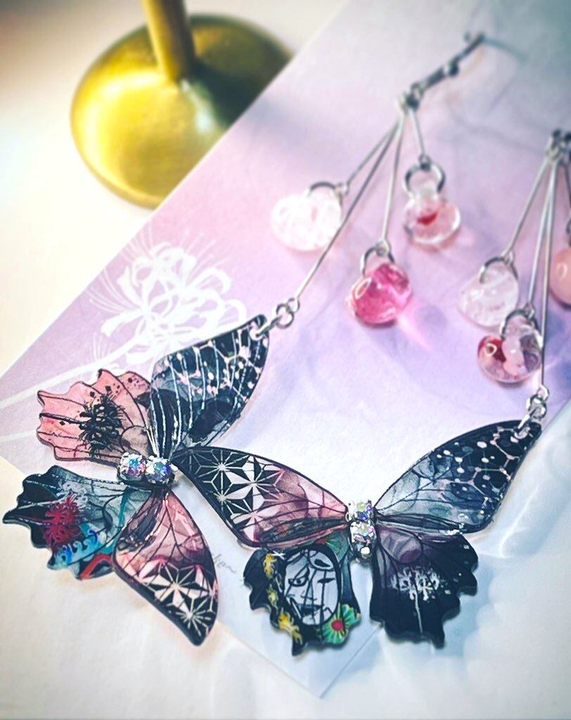立体的な蝶々の作品及び蝶々の羽根の作品は本物の蝶の羽根のような繊細な雰囲気を表現するため市販ではあまり見かけない薄いアクリルを取り寄せて制作しています。通常より繊細な作りとなりますためお取り扱いにはご注意ください。