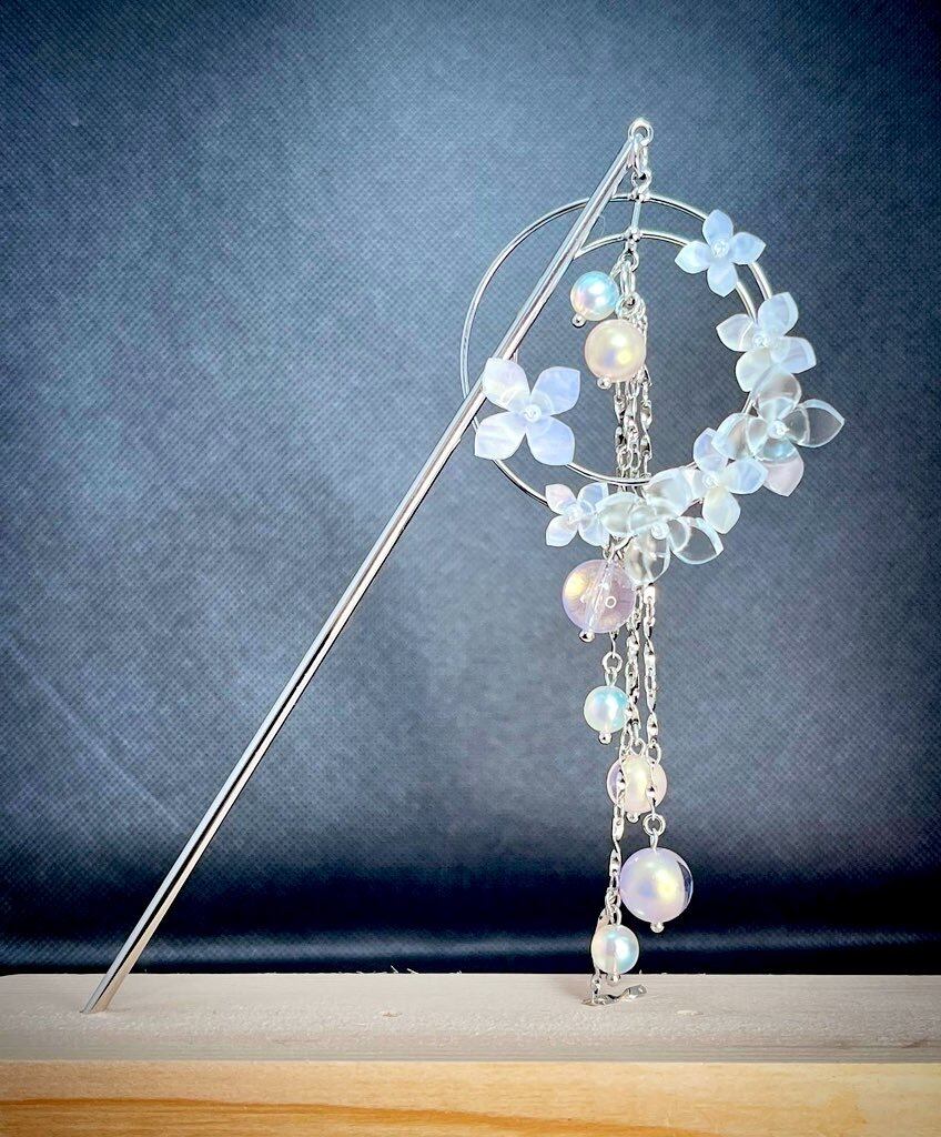 特殊なアクリルで作った白い紫陽花と半透明の紫陽花に「朝ぼらけ」をイメージしたカラーのパールを添えて洋装にも和装にも合わせやすい雰囲気に作ってみました。