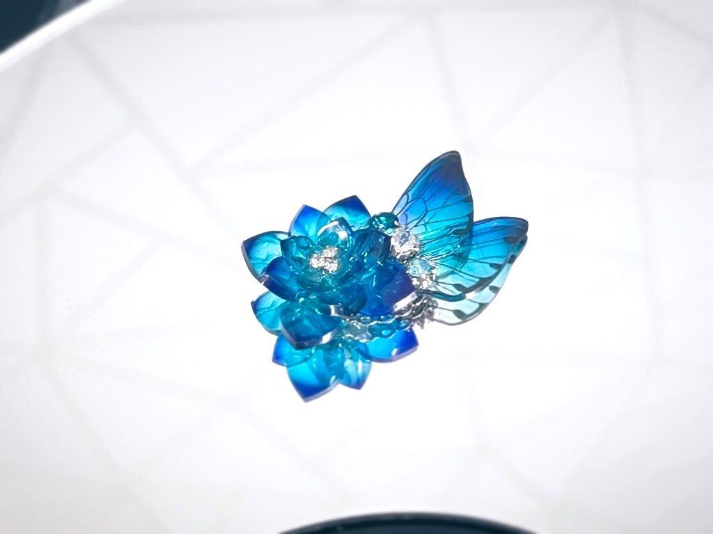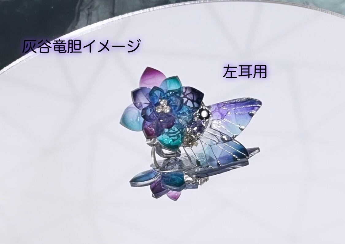 立体的なお花に翅を添えたイヤーカフ。立体的なお花と翅は使用しているアクリルの厚さや加工方法が異なり制作にとても時間はかかるのですが渾身の作品に仕上がっています。