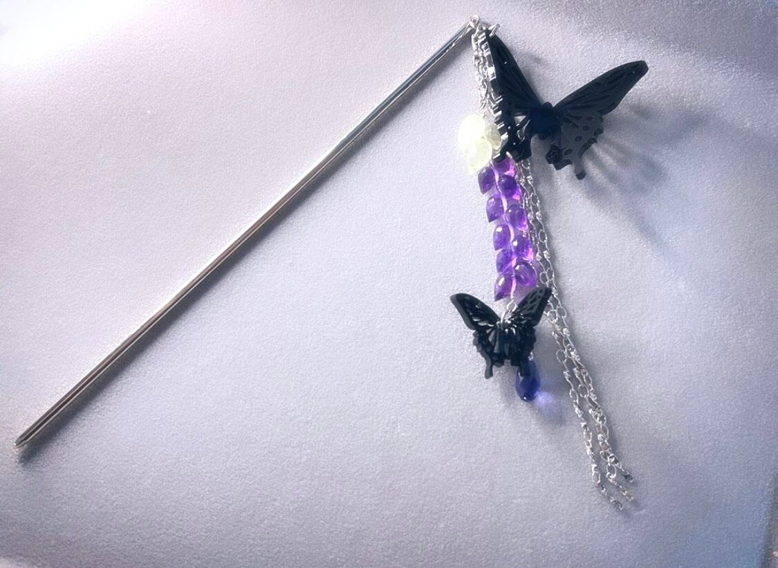 藤の花のような天然石に蝶々を添えて綺麗めなかんざしに仕上げてみました。
