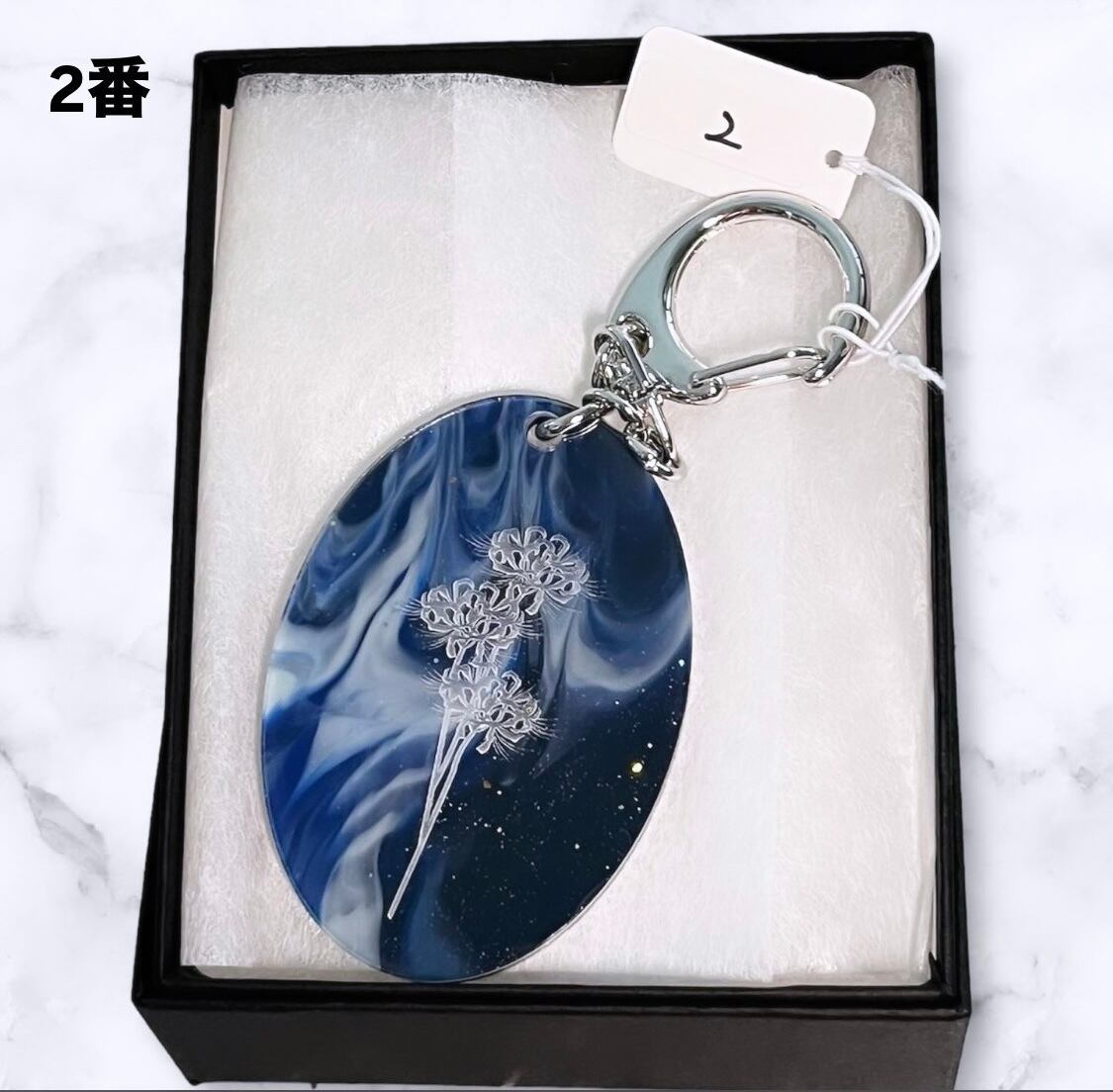 透明のアクリルに彼岸花の彫刻を入れて特殊な模様の3mm厚のアクリルと重ねて彫刻部と背景に遠近感を持たせたキーホルダーに仕上げてみました。ユニセックスの作品なので男性にもおすすめです。