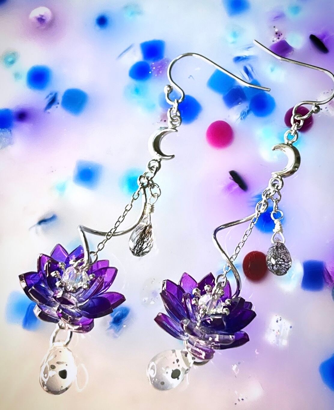 アクリル(レーザー加工・UV加工←UVレジンで加工していることではありません。)・ガラスビーズ・天然石・レジン・金具:真鍮(シルバーカラー・画像参照)
