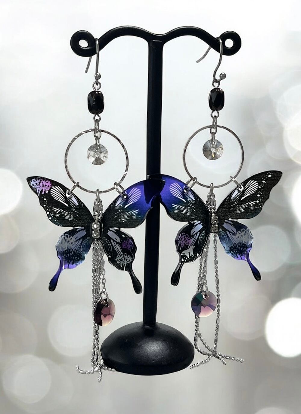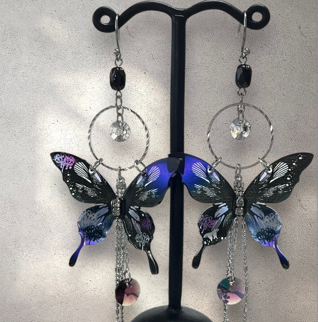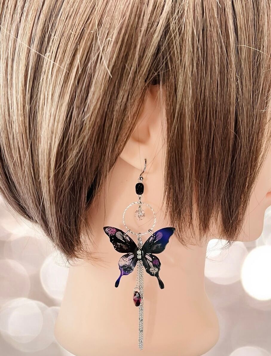 青紫色の翅が綺麗な蝶々のピアス/イヤリング。チャームの紫色の丸いストーンは青く光るタイプのもので現在は手に入らないストーンだったりも。