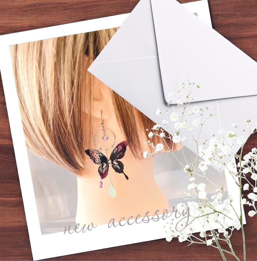 ピンク×グリーンの羽織のカラーをイメージした蝶々のピアス/イヤリング。藤の花の透かし模様を入れて大人かわいい雰囲気で仕上げてみました。